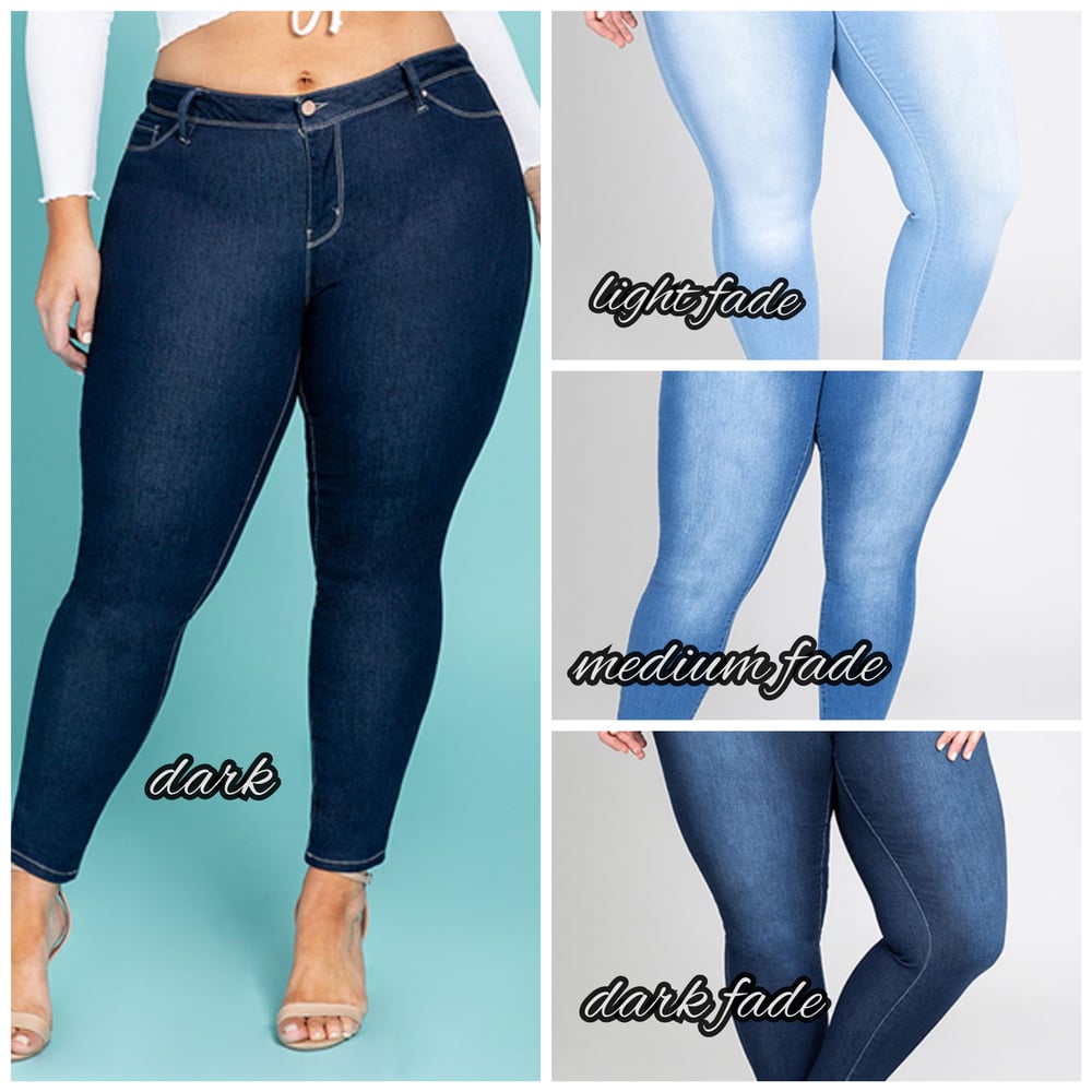 Plus Size Mid-Rise Denim Skinny Jeans. Featuring faux front pockets, fading with whisker detailing, single-button closure, front zip, and belt loops.
